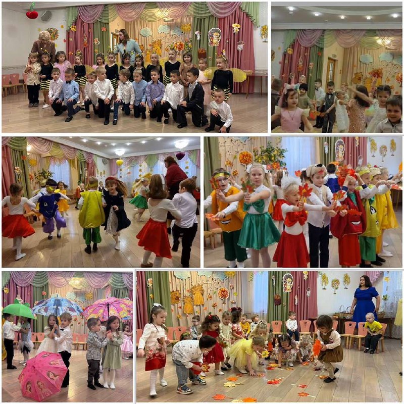 Дети вместе встречают Осень — веселятся, танцуют, играют и украшают группу яркими листьями.